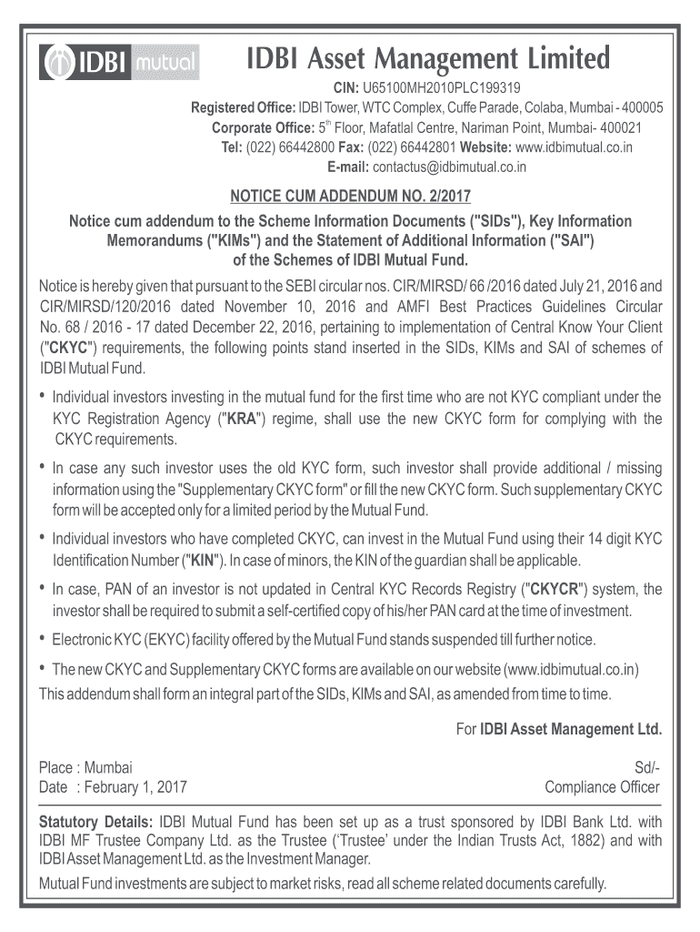 Get the free Registered Office: IDBI Tower, WTC Complex, Cuffe Parade, Colaba, Mumbai - 400005