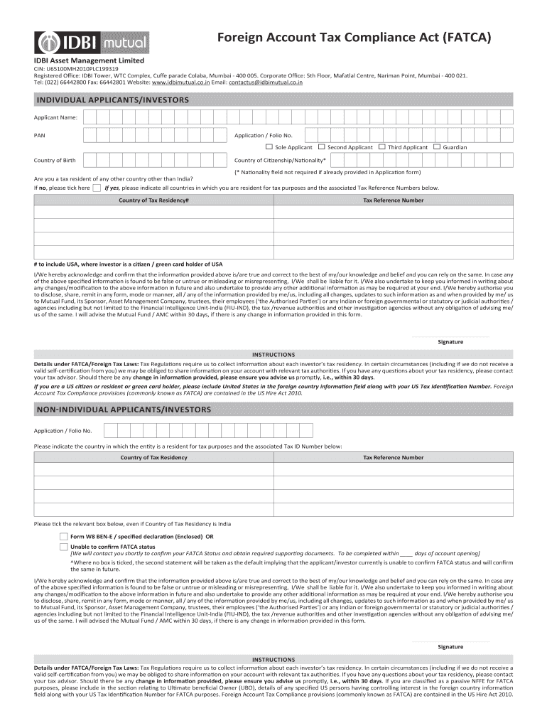 Foreign Account Tax Compliance Act (FATWA) IDB Asset Management Limited IN: U65100MH2010PLC199319 Registered One: IDB Tower, WTC Complex, Cue parade Clara, Mumbai 400 005. Corporate One: 5th Floor,