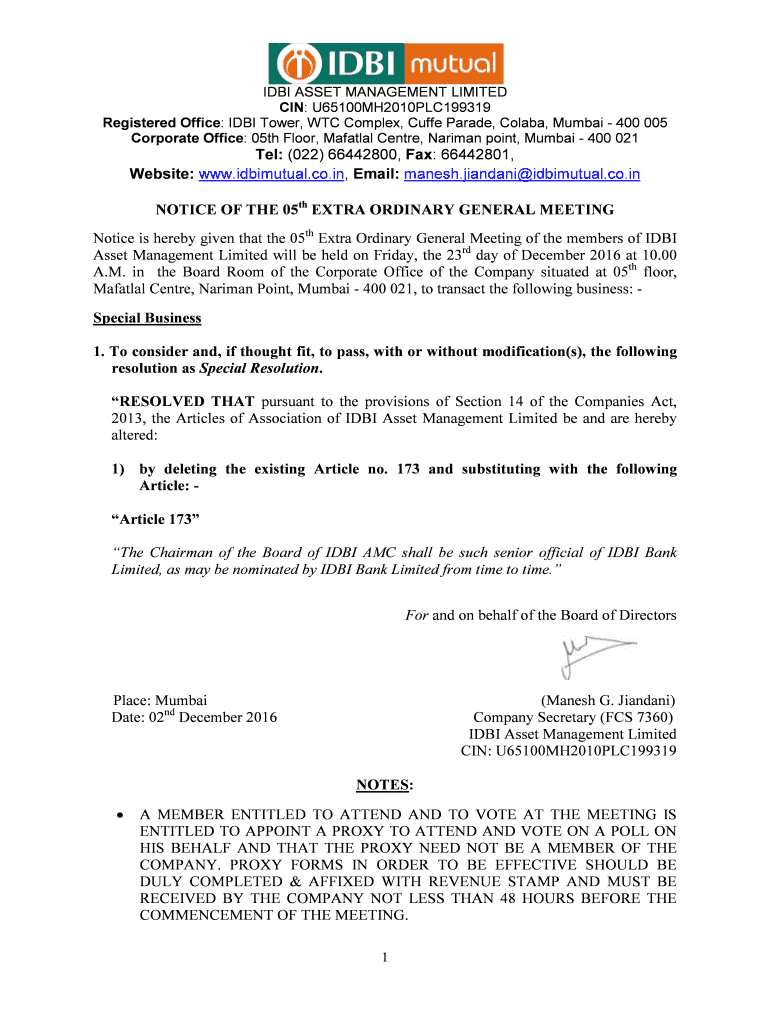The registered office idbi tower can be filled out by providing the company name, address, and other required details in the prescribed form.