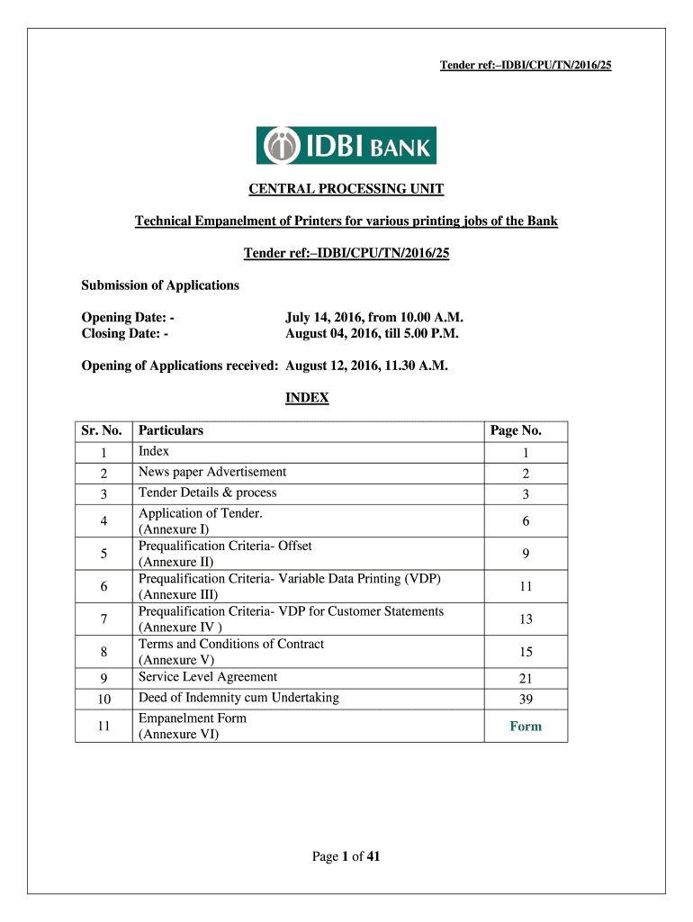 Tender ref:IDB/CPU/TN/2016/25CENTRAL PROCESSING UNIT Technical Embankment of Printers for various printing jobs of the Bank Tender ref:IDB/CPU/TN/2016/25 Submission of Applications Opening Date: Closing