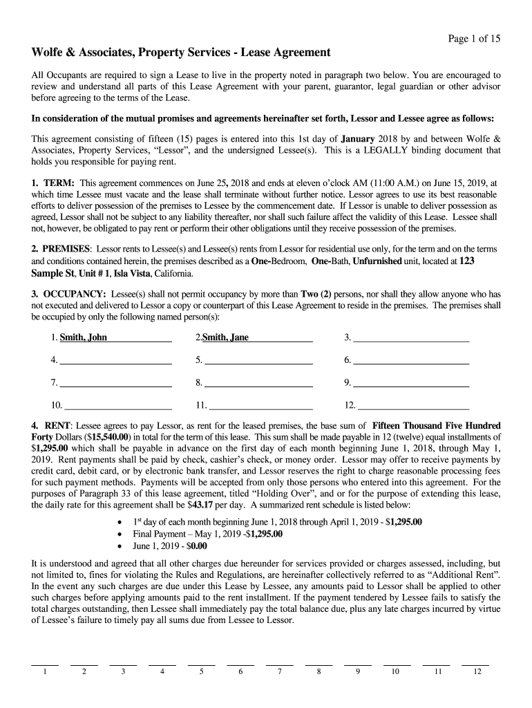 Page 1 of 15Wolfe & Associates, Property Services Lease Agreement All Occupants are required to sign a Lease to live in the property noted in paragraph two below. You are encouraged to review and