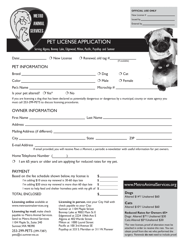 OFFICIAL USE ONLY New License # Issued by Entered by PET LICENSE APPLICATION Serving Along, Donna Lake, Edgewood, Milton, Pacific, Puyallup and Sumner Date: New License Renewal, old tag #(If available)PET