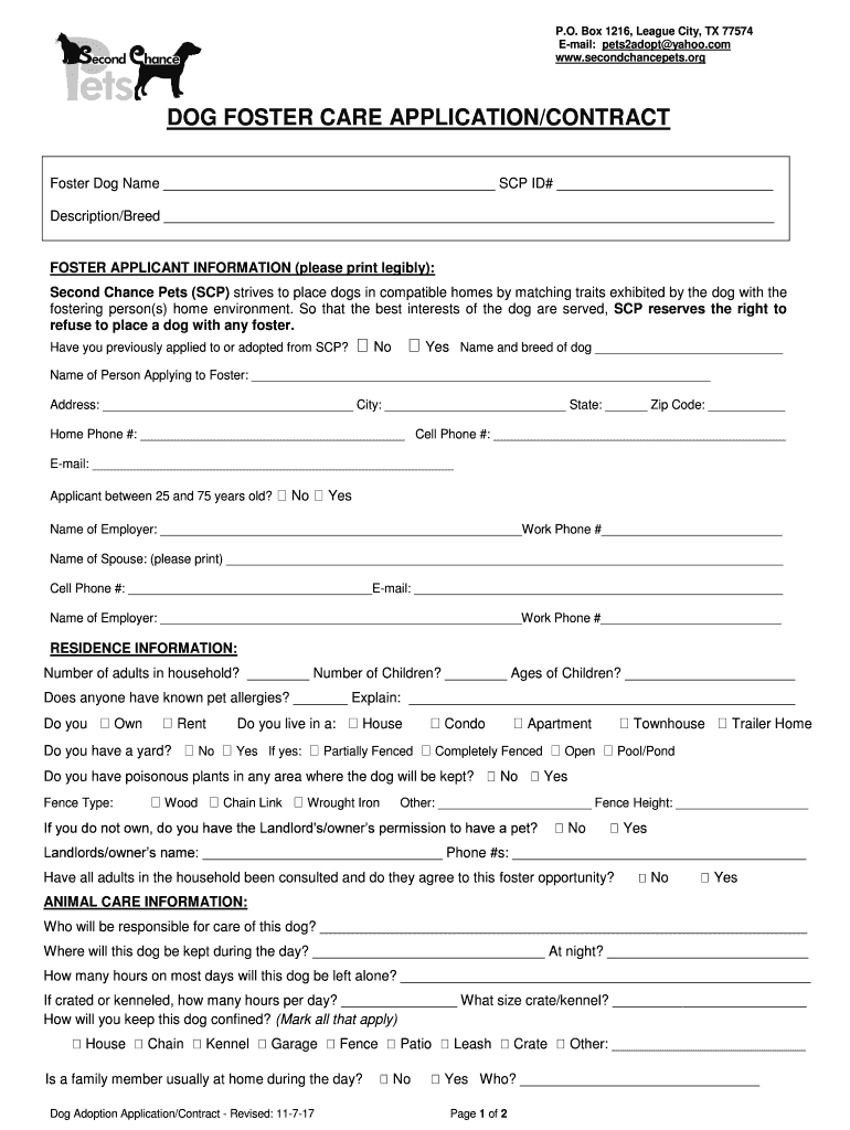 P.O. Box 1216, League City, TX 77574 Email: pets2adopt yahoo.com www.secondchancepets.orgDOG FOSTER CARE APPLICATION/CONTRACT Foster Dog Name SCP ID# Description/Breed FOSTER APPLICANT INFORMATION