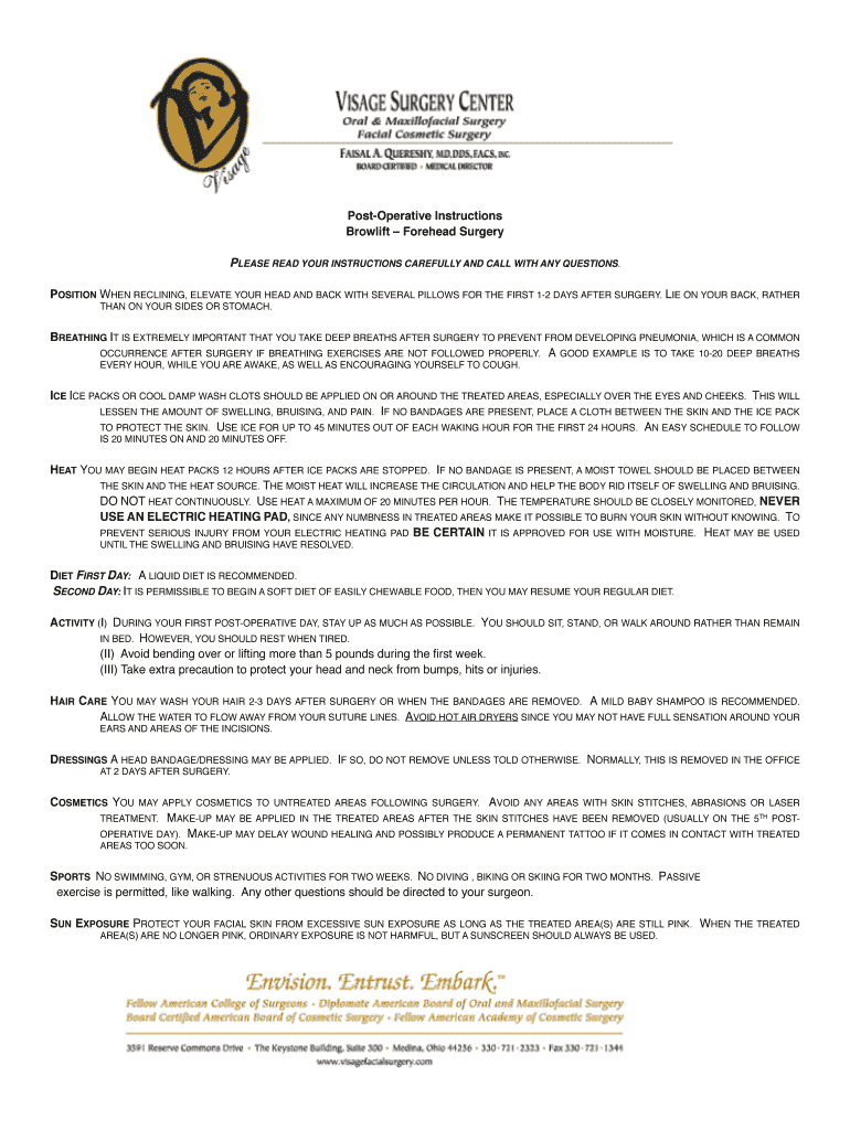 PostOperative Instructions Brow lift Forehead Surgery PLEASE READ YOUR INSTRUCTIONS CAREFULLY AND CALL WITH ANY QUESTIONS. POSITION WHEN RECLINING, ELEVATE YOUR HEAD AND BACK WITH SEVERAL PILLOWS
