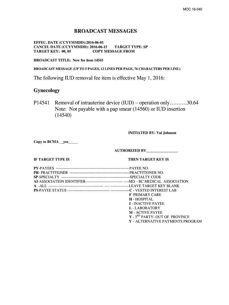 MOC 16040BROADCAST MESSAGES EFFECT. DATE (CCYYMMDD):20160601 CANCEL DATE (CCYYMMDD): 20160615 TARGET TYPE: SP TARGET KEY: 00, 05 COPY MESSAGE FROM BROADCAST TITLE: New fee item 14541 BROADCAST Messages