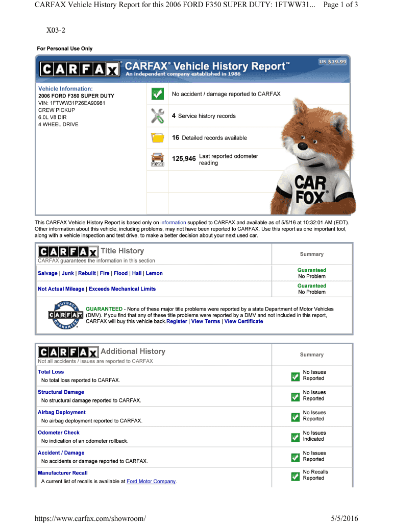 CARFAX Vehicle History Report for this 2006 FORD F350 SUPER DUTY: 1FTWW31... Page 1 of 3×032