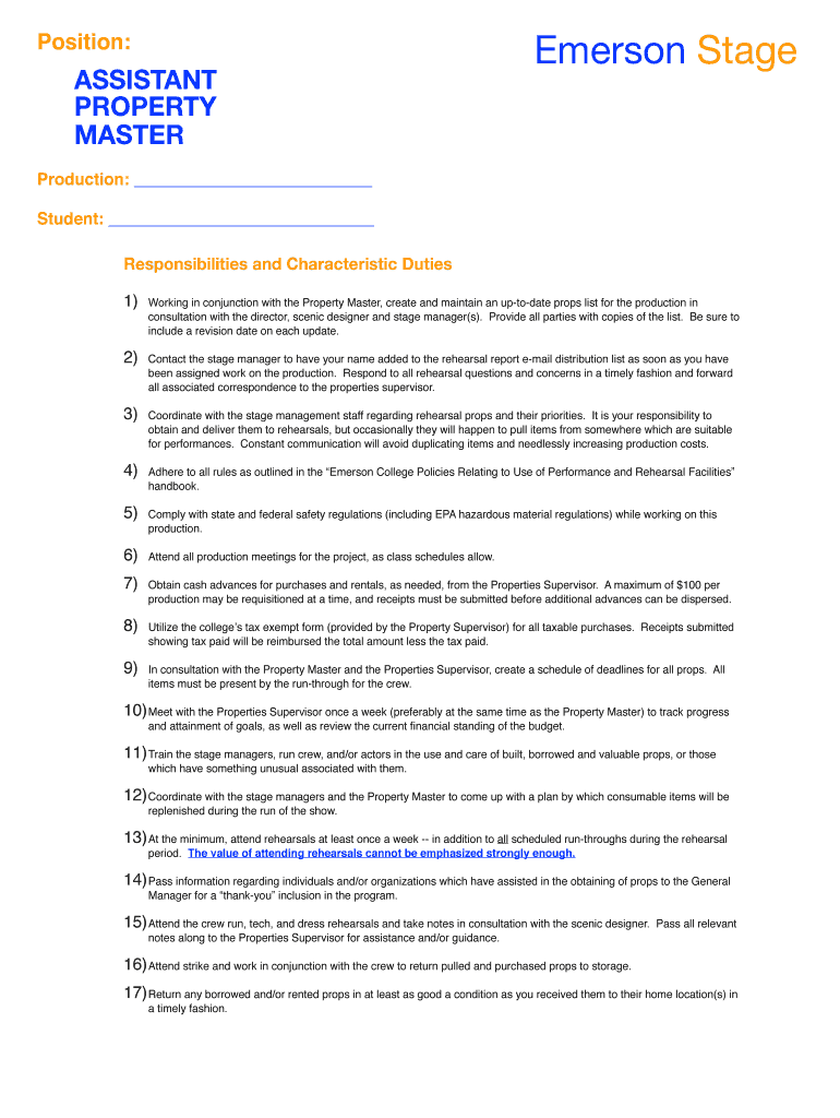 Position:ASSISTANT PROPERTY MASTER Emerson StageProduction: Student: Responsibilities and Characteristic Duties 1)Working in conjunction with the Property Master, create and maintain an update props