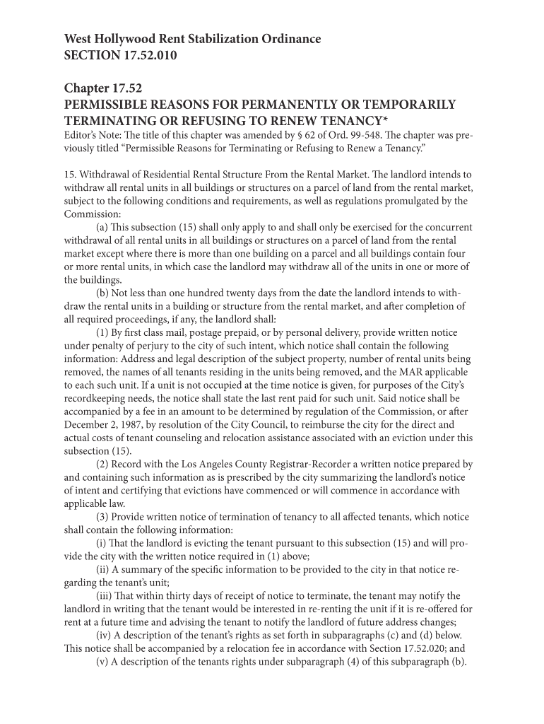 West Hollywood Rent Stabilization Ordinance SECTION 17.52.010 Chapter 17.52 PERMISSIBLE REASONS FOR PERMANENTLY OR TEMPORARILY TERMINATING OR REFUSING TO RENEW TENANCY×Editors Note: The title of