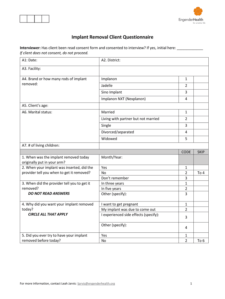 Implant Removal Client Questionnaire Interviewer: Has client been read consent form and consented to interview? If yes, initial here: If client does not consent, do not proceed. A1: Date:A2. District:A3.
