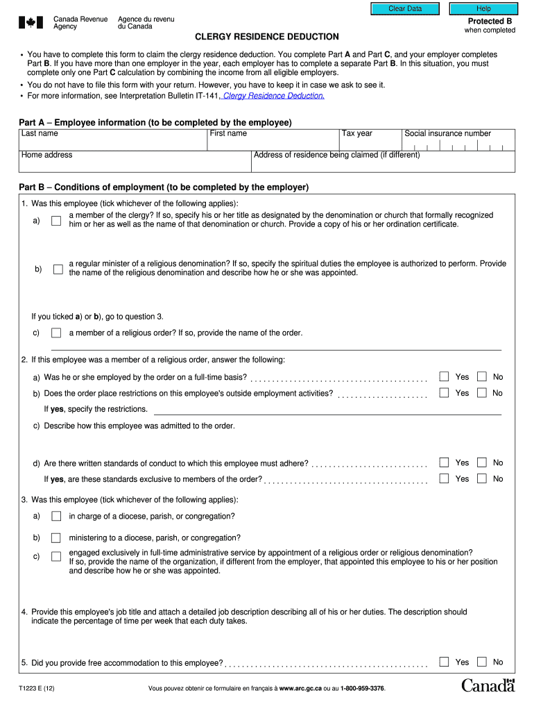 Clergy members in Canada are eligible to use this form to claim deductions for their residence costs. Both employees and their employers need to complete relevant sections.
