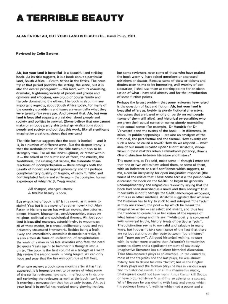 A TERRIBLE BEAUTY ALAN PATRON: AH, BUT YOUR LAND IS BEAUTIFUL. David Philip, 1981. Reviewed by Colin Gardner. Ah, but your land is beautiful is a beautiful and striking book. As its title suggests,