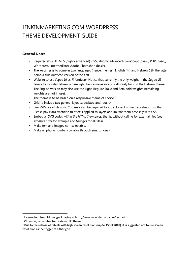 LINKINMARKETING.COM WordPress THEME DEVELOPMENT GUIDE General Notes Required skills: HTML5 (highly advanced), CSS3 (highly advanced), JavaScript (basic), PHP (basic), WordPress (intermediate), Adobe