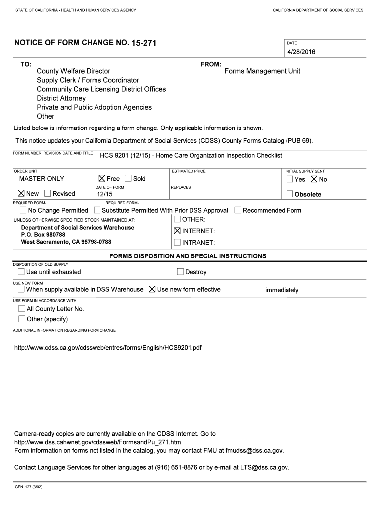 STATE OF CALIFORNIA HEALTH AND HUMAN SERVICES AGENCYCALIFORNIA DEPARTMENT OF SOCIAL SERVICESNOTICE OF FORM CHANGE NO. 15271DATE4/28/2016 TO:FROM:County Welfare Director Supply Clerk / Forms Coordinator
