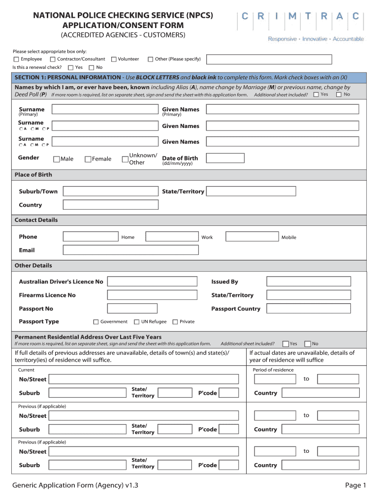 NATIONAL POLICE CHECKING SERVICE (NPCs) APPLICATION/CONSENT FORM (ACCREDITED AGENCIES CUSTOMERS) Please select appropriate box only: EmployeeContractor/Consultants this a renewal check? YesVolunteerOther