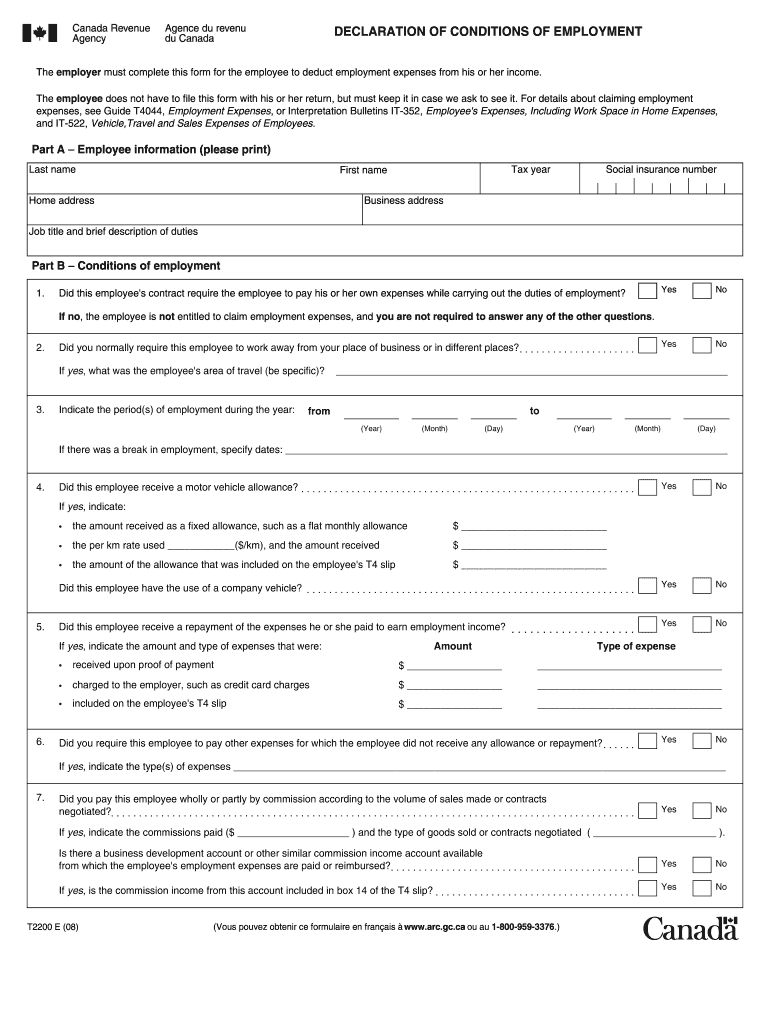 Employers in Canada can use the Canada Employment Expenses Declaration Form to record employee expenses when documenting deductions on their income tax returns.