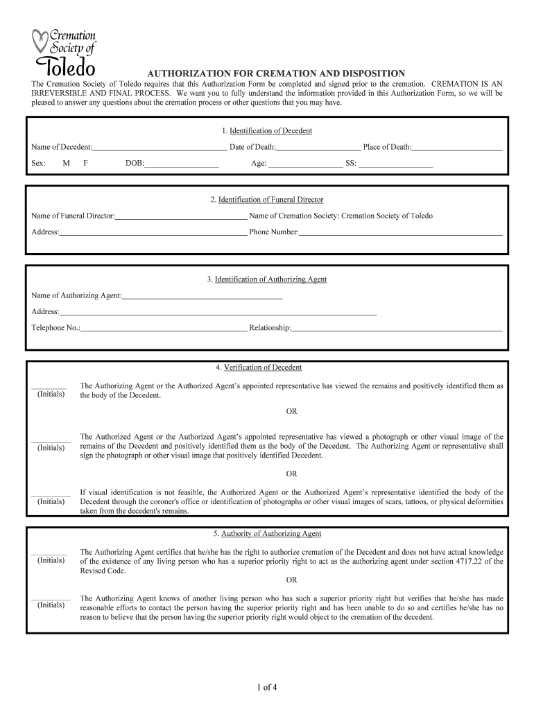 Get the free Authorization for Cremation and Disposition