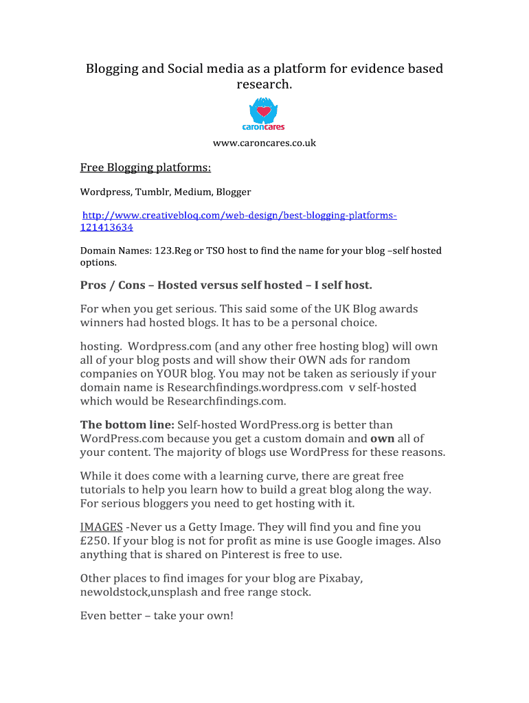 Blogging and Social media as a platform for evidence based research.www.caroncares.co.ukFree Blogging platforms: WordPress, Tumblr, Medium, Blogger http://www.creativebloq.com/webdesign/bestbloggingplatforms121413634