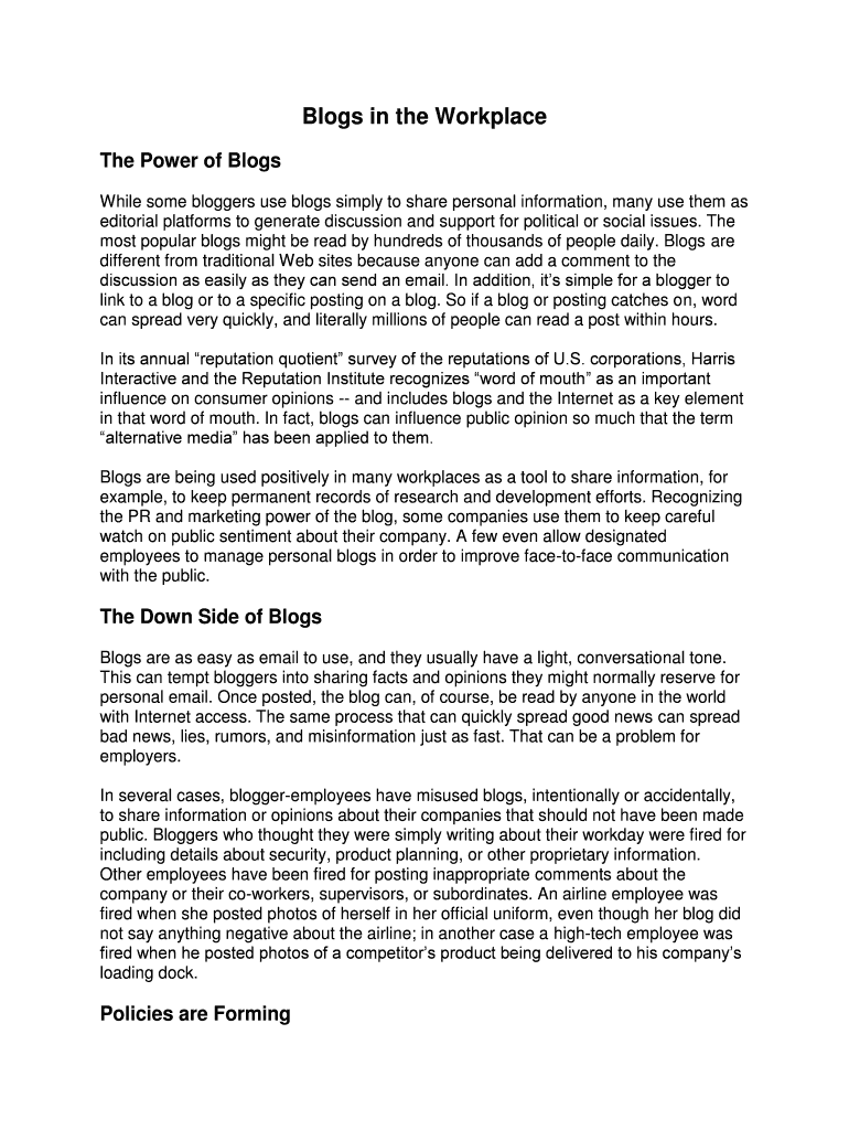 Blogs in form workplace are reports or updates posted on internal company platforms.