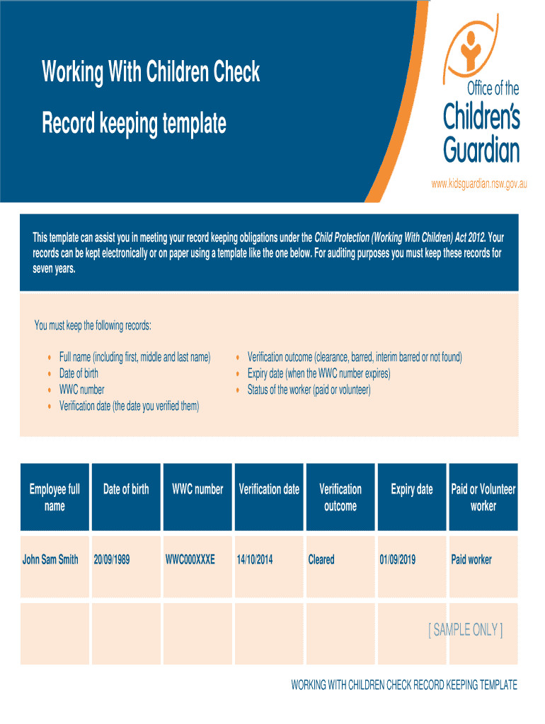 Working With Children Check Record keeping template www.kidsguardian.nsw.gov.auThis template can assist you in meeting your record keeping obligations under the Child Protection (Working With Children)