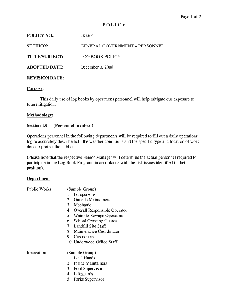 Page 1 of 2 POLICY NO.:GG.6.4SECTION:GENERAL GOVERNMENT PERSONNELTITLE/SUBJECT:LOG BOOK POLICYADOPTED DATE:December 3, 2008REVISION DATE: Purpose: This daily use of log books by operations personnel