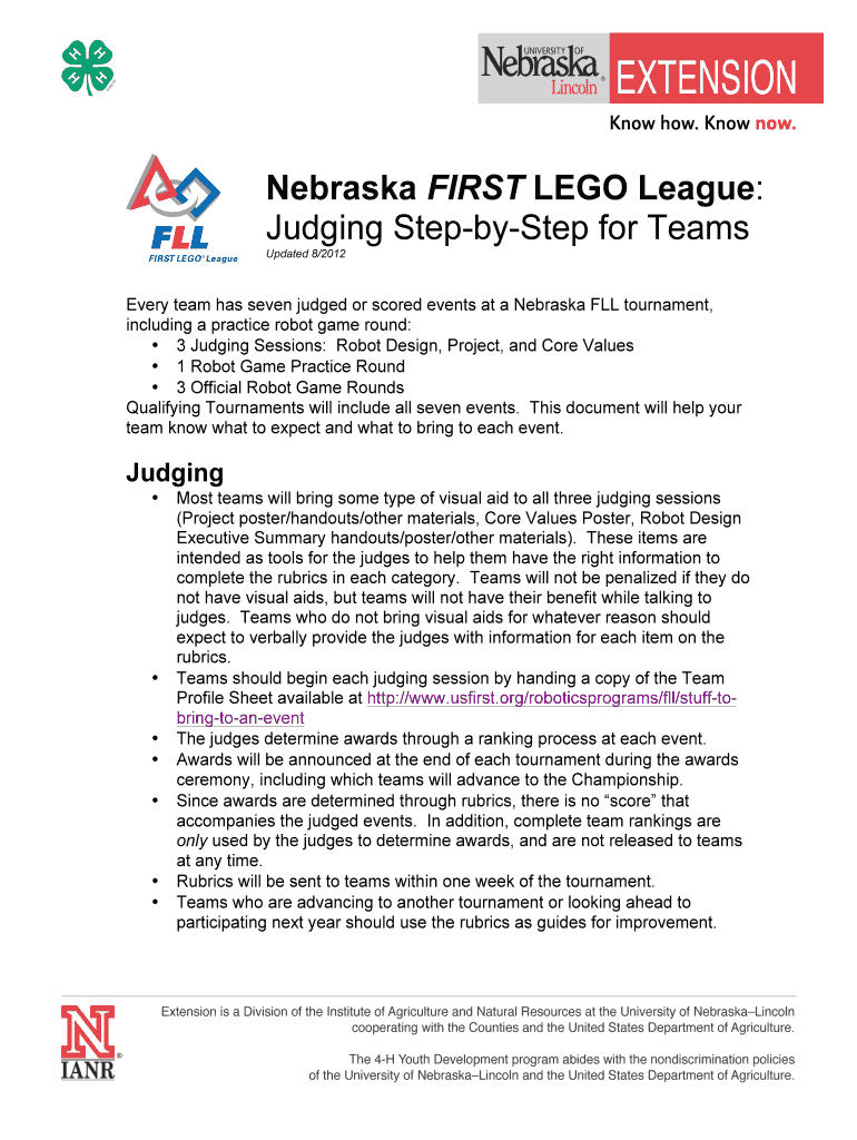 Nebraska FIRST LEGO League: Judging Stepsister for Teams Updated 8/2012Every team has seven judged or scored events at a Nebraska FLL tournament, including a practice robot game round: 3 Judging Sessions: