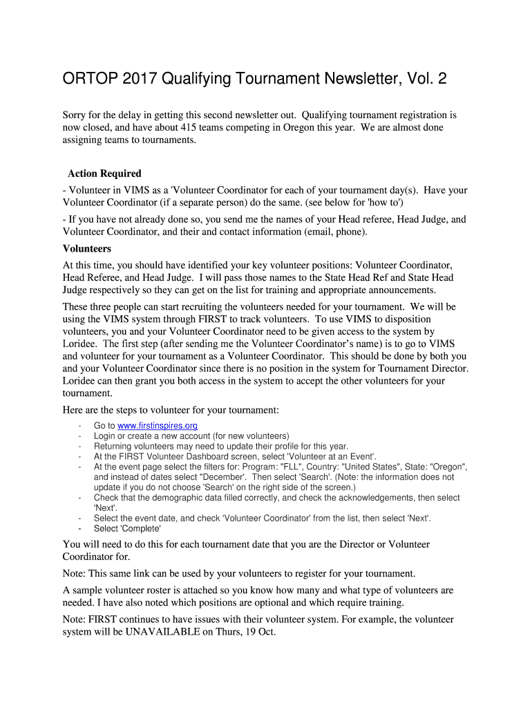 OR TOP 2017 Qualifying Tournament Newsletter, Vol. 2 Sorry for the delay in getting this second newsletter out. Qualifying tournament registration is now closed, and have about 415 teams competing