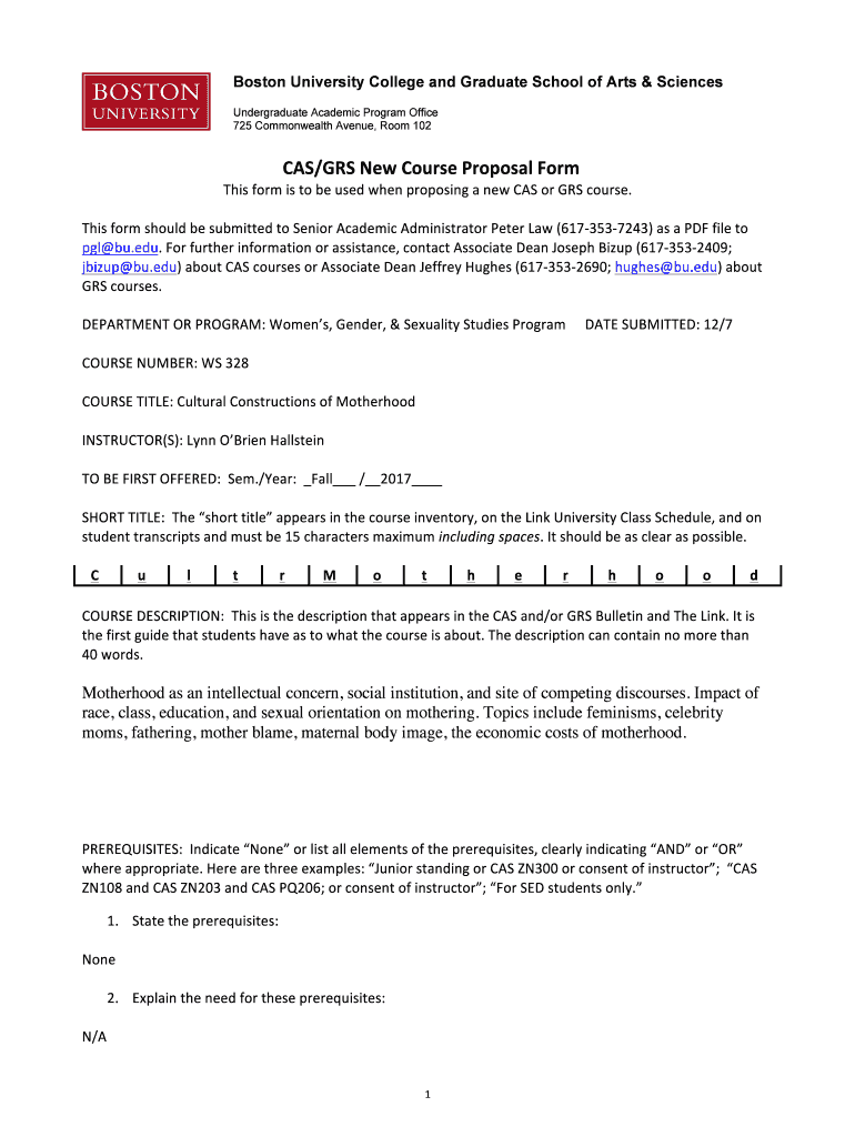 Boston University College and Graduate School of Arts & Sciences Undergraduate Academic Program Office 725 Commonwealth Avenue, Room 102CAS/GRS New Course Proposal Forms form is to be used when proposing