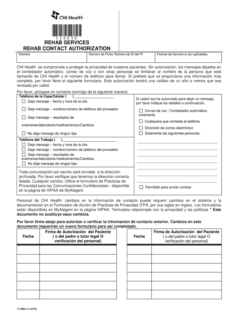 The patient receiving rehabilitation services is required to file the rehab contact authorization form.