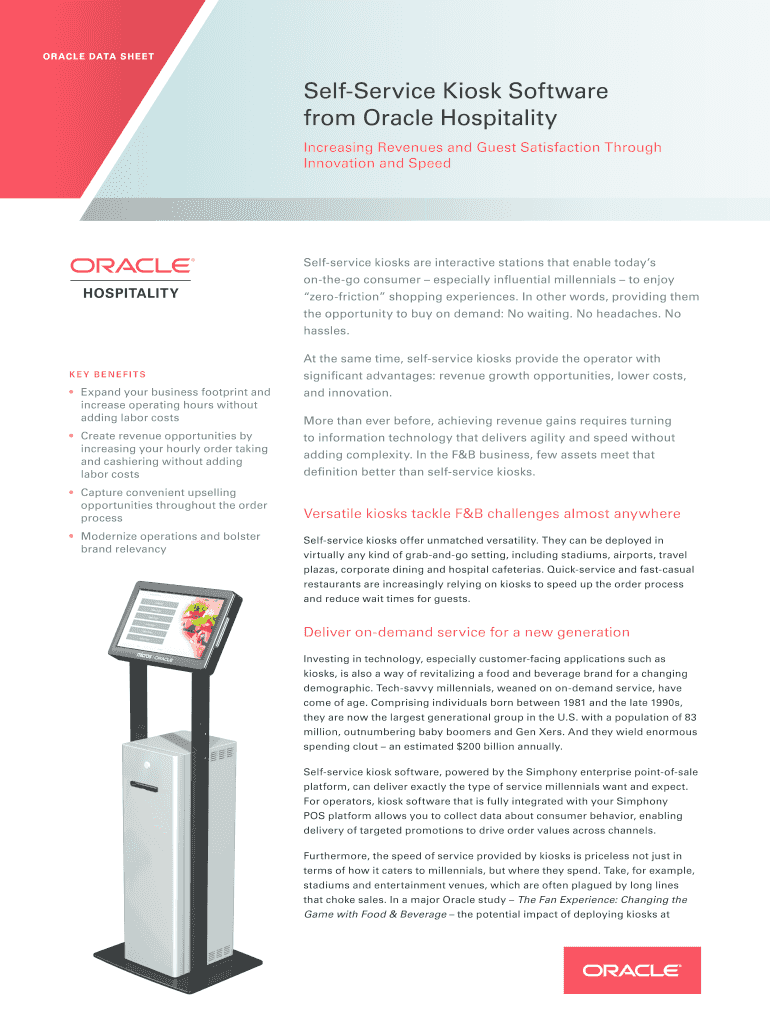 O R AC L E DATA S H E Self-service Kiosk Software from Oracle Hospitality Increasing Revenues and Guest Satisfaction Through Innovation and SpeedSelfservice kiosks are interactive stations that enable