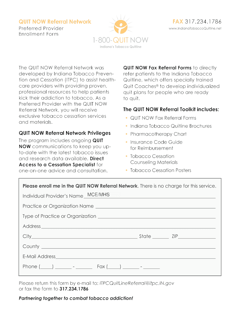 Enrollment Form. IndianaTobaccoQuitline.netIndianas Tobacco QuitlineThe QUIT NOW Referral Network was
