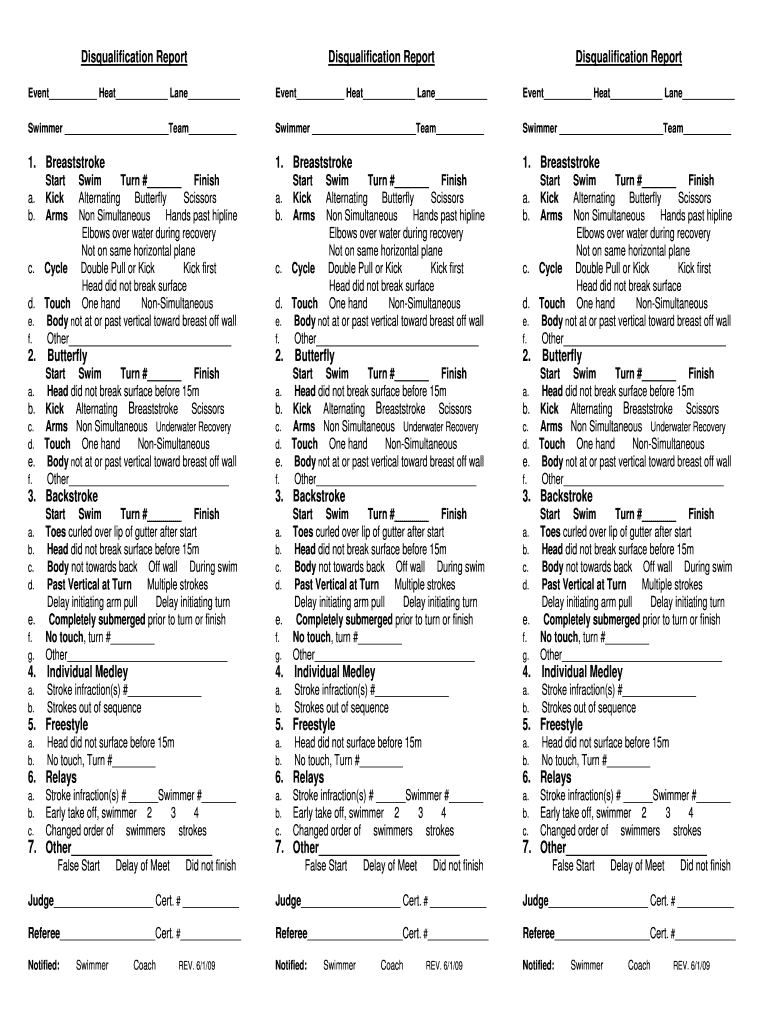 Disqualification ReportDisqualification Represent Heat Lane Event Heat Lane Event Heat Lane Swimmer Team 1. Breaststroke1. Breaststroke1. Breaststroke. b.c. d. e. f.2. a.b. c. d.e. f. Start Kick ArmsSwim