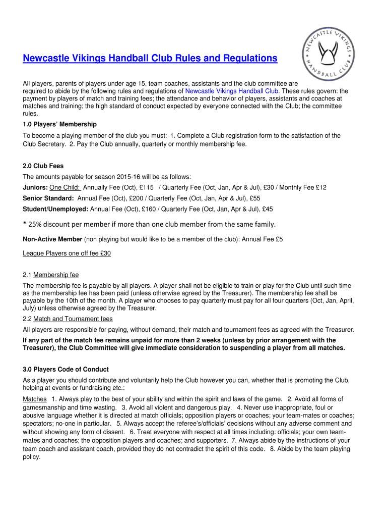 Get the free Newcastle Vikings Handball Club Rules and Regulations