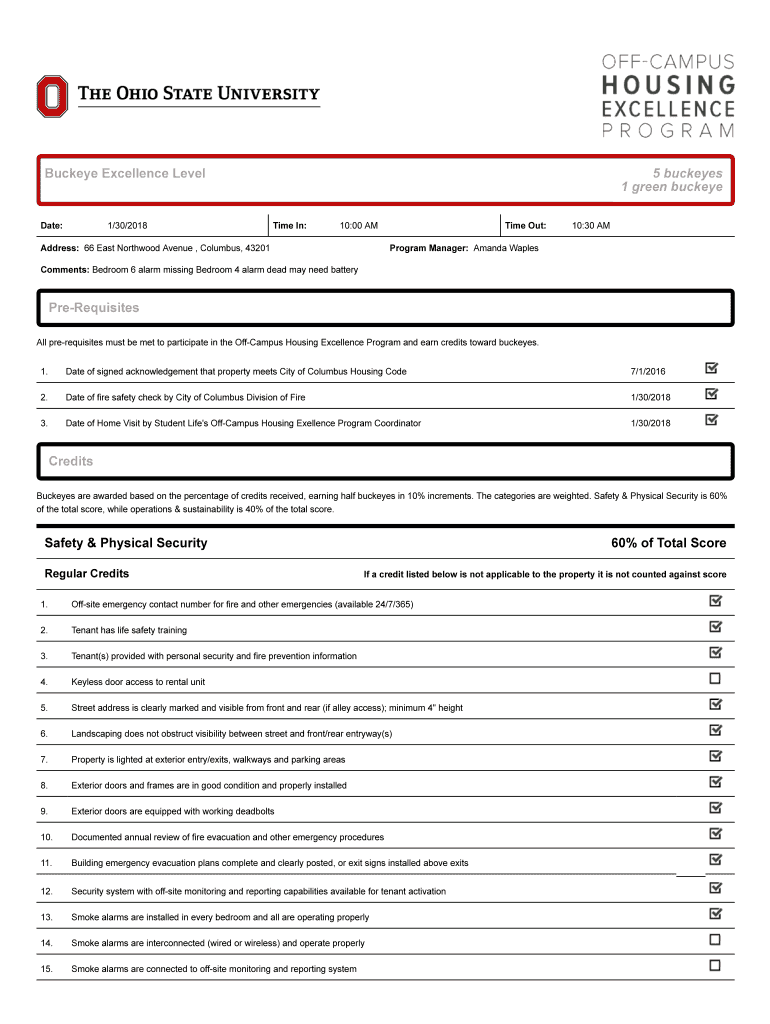 Time In:10:00 Address: 66 East North wood Avenue, Columbus, 43201Time Out:10:30 Program Manager: Amanda WaplesComments: Bedroom 6 alarm