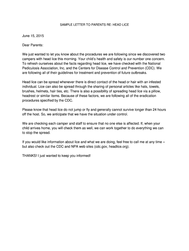 Get the free SAMPLE LETTER TO PARENTS RE: HEAD LICE