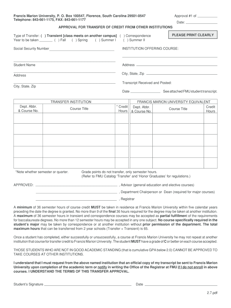 Francis Marion University, P. O. Box 100547, Florence, South Carolina 29501-0547 Telephone: 843-661-1175, FAX: 843-661-1177 Approval #1 of Date: APPROVAL FOR TRANSFER OF CREDIT FROM OTHER INSTITUTIONS