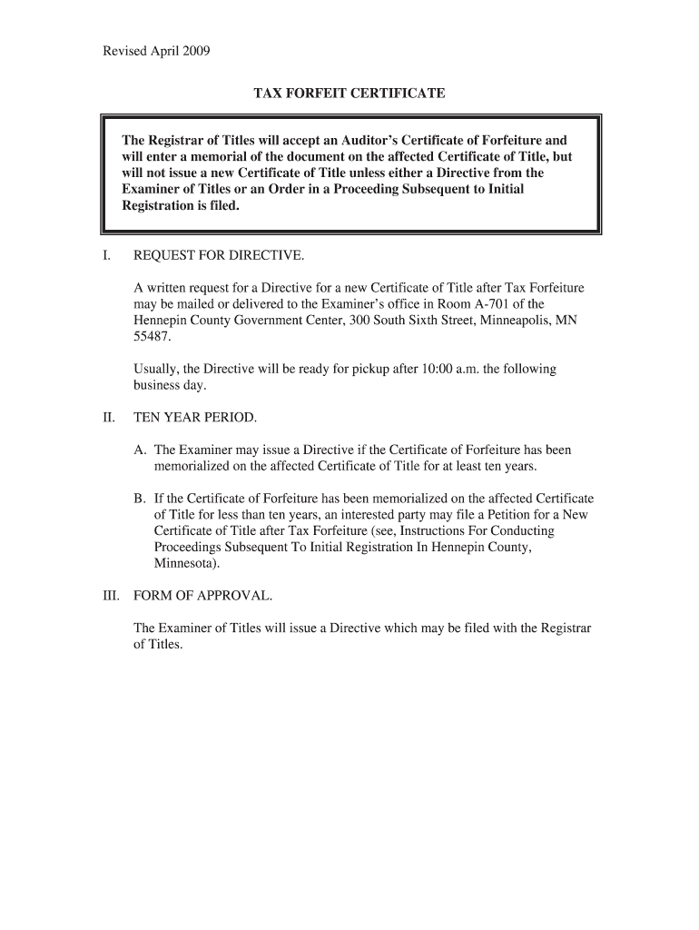 Property owners who have failed to pay their taxes on time are required to file a tax forfeit certificate.