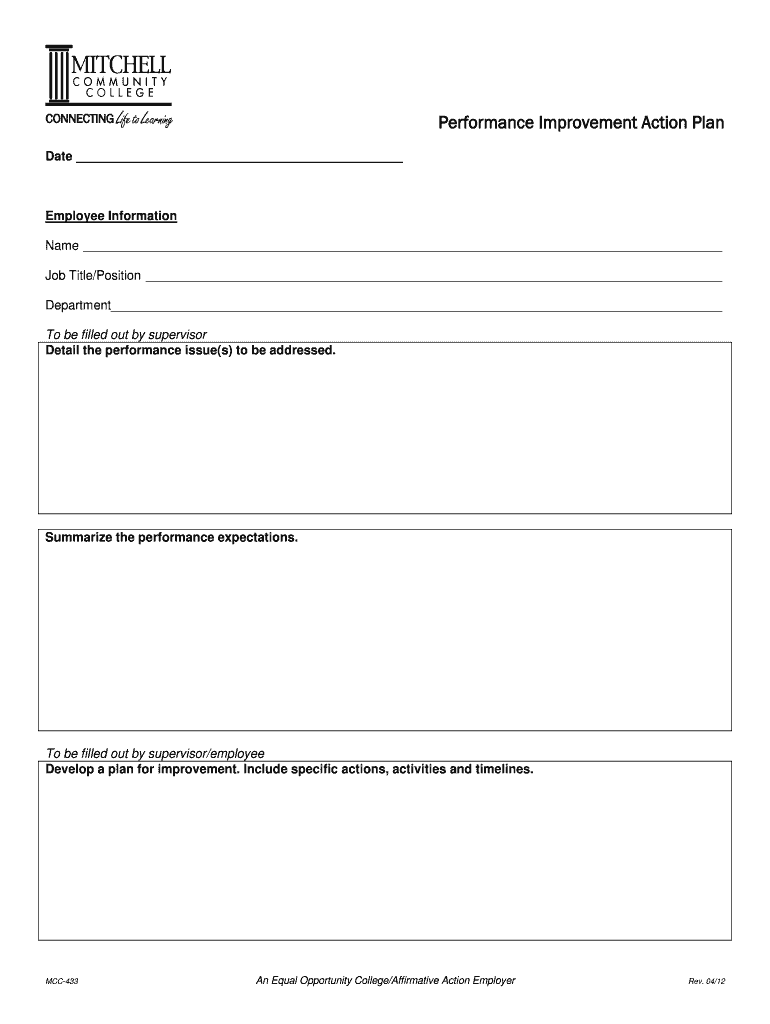 Each section of the performance improvement action plan form contains critical information that must be accurately filled out. Important fields include: