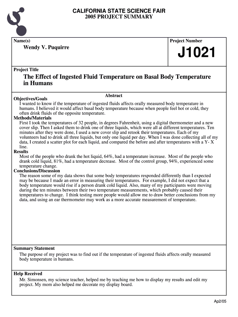 2005 PROJECT SUMMARYName(s)Wendy V. PuquirreProject NumberJ1021Project Title Effect of Ingested Fluid Temperature on Basal Body Temperature