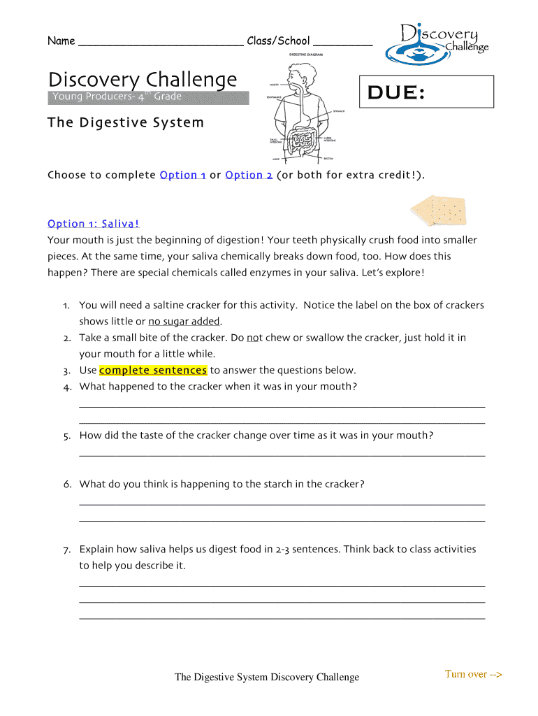 Name Class/School Discovery Challenge Young Producers 4th Grade DUE:The Digestive SystemChoose to complete Option 1 or Option 2 (or both for extra credit!). Option 1: Saliva! Your mouth is just the