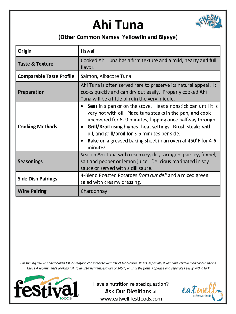 AHI Tuna(Other Common Names: Yellow fin and Big eye) OriginHawaiiTaste & TextureCooked AHI Tuna has a firm texture and a mild, hearty and full flavor. Comparable Taste ProfileSalmon, Albacore TunaPreparationCooking