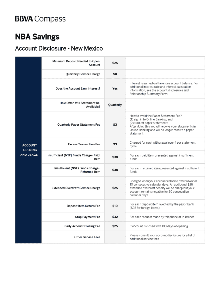 NBA Savings Account Disclosure New Mexico Minimum Deposit Needed to Open Account×25Quarterly Service Charge×0Does the Account Earn Interest? How Often Will Statement be Available?ACCOUNTYesInterest