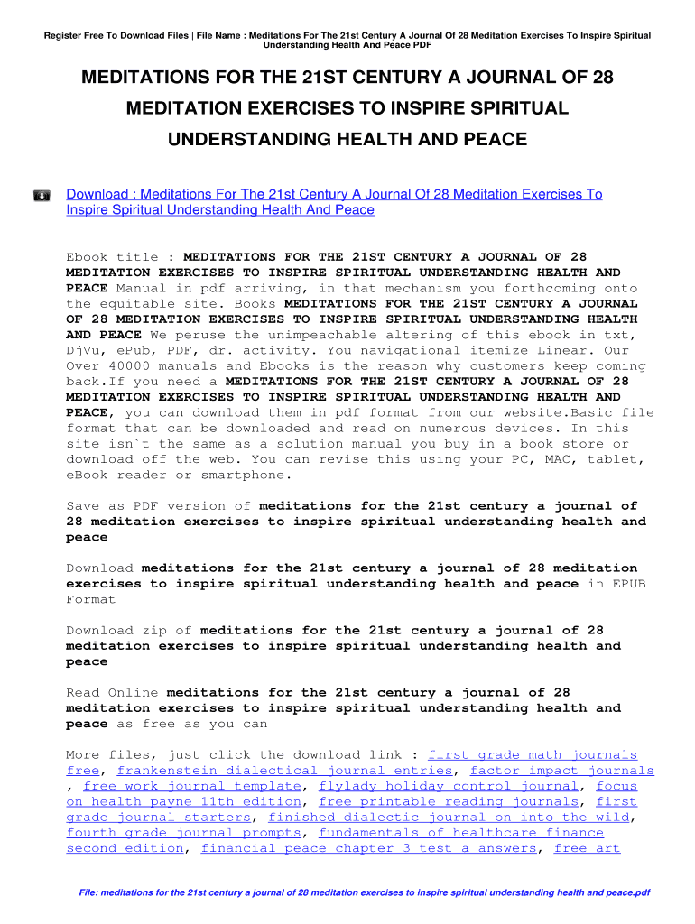 Register Free To Download Files File Name : Meditations For The 21st Century A Journal Of 28 Meditation Exercises To Inspire Spiritual Understanding Health And Peace MEDITATIONS FOR THE 21ST CENTURY