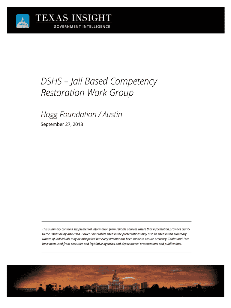 DSS Jail Based Competency Restoration Work Group Hog Foundation / Austin September 27, 2013This summary contains supplemental information from reliable sources where that information provides clarity
