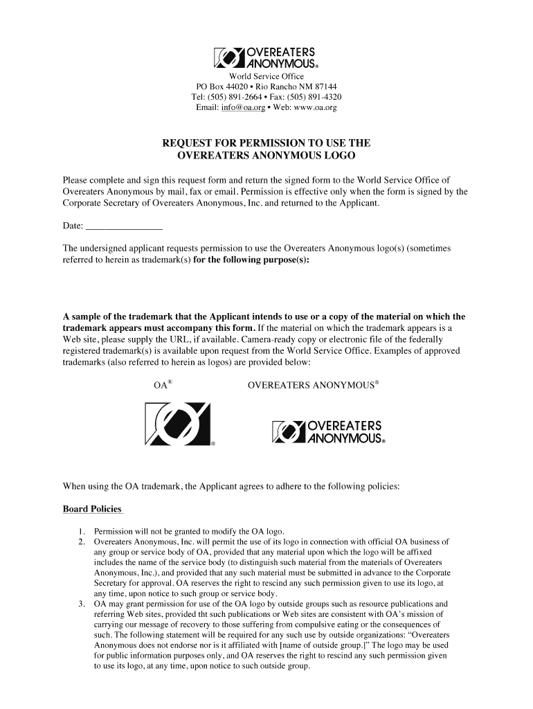 Get the free Permission to Use the OA Logo form - Overeaters Anonymous - oa