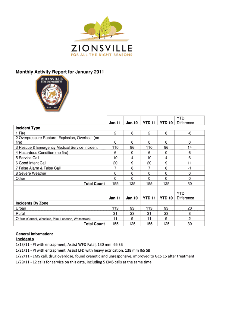 Monthly Activity Report for January 2011Incident Type 1 Fire 2 Overpressure Rupture, Explosion, Overheat (no fire) 3 Rescue & Emergency Medical Service Incident 4 Hazardous Condition (no fire) 5 Service