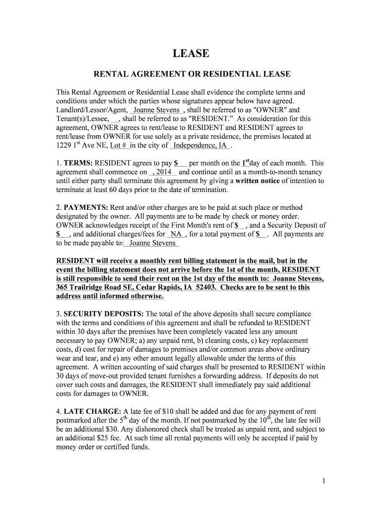 LEASE RENTAL AGREEMENT OR RESIDENTIAL LEASE This Rental Agreement or Residential Lease shall evidence the complete terms and conditions under which the parties whose signatures appear below have agreed.