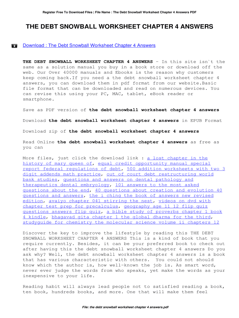 Register Free To Download Files File Name : The Debt Snowball Worksheet Chapter 4 Answers THE DEBT SNOWBALL WORKSHEET CHAPTER 4 ANSWERS Download : The Debt Snowball Worksheet Chapter 4 Answers DEBT
