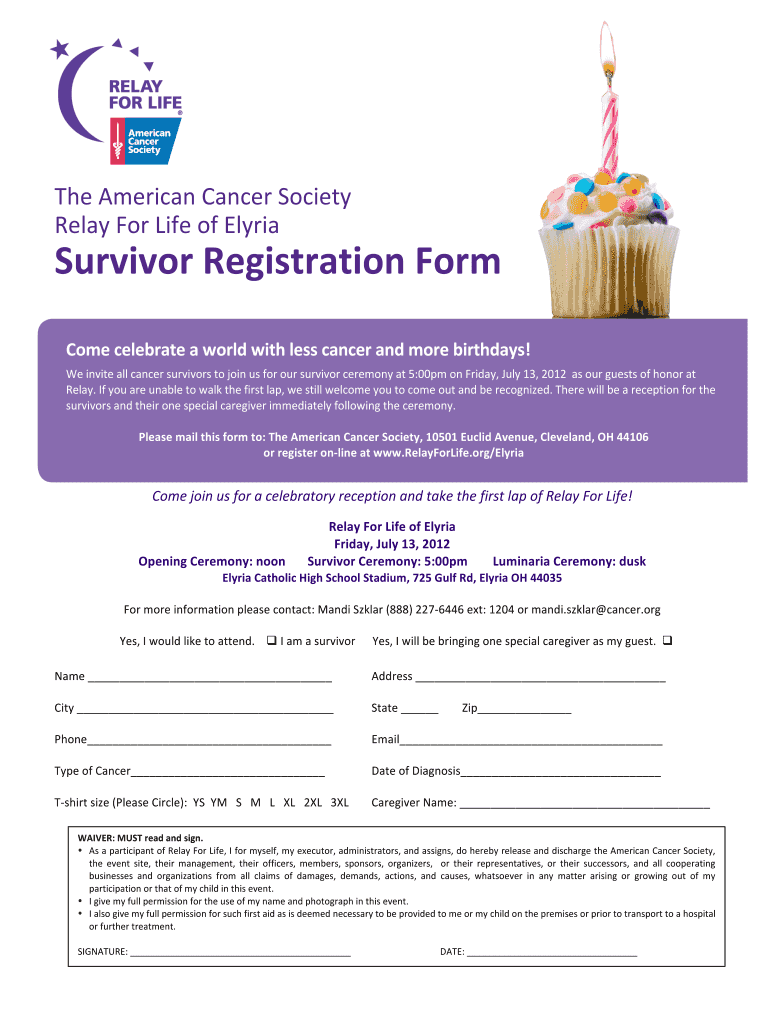 The American Cancer Society Relay For Life of Elyria Survivor Registration Form Come celebrate a world with less cancer and more birthdays! We invite all cancer survivors to join us for our survivor