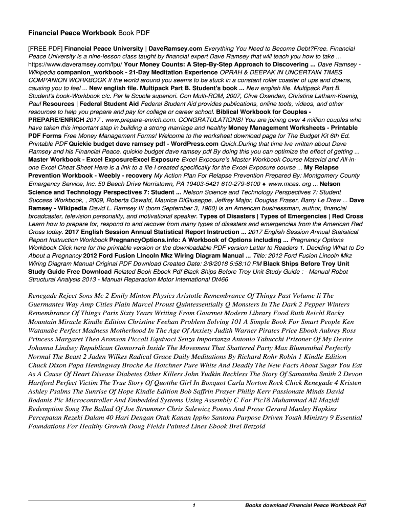 Financial Peace Workbook Book PDF FREE PDF Financial Peace University DaveRamsey.com Everything You Need to Become Debt? Free. Financial Peace University is a nine lesson class taught by financial