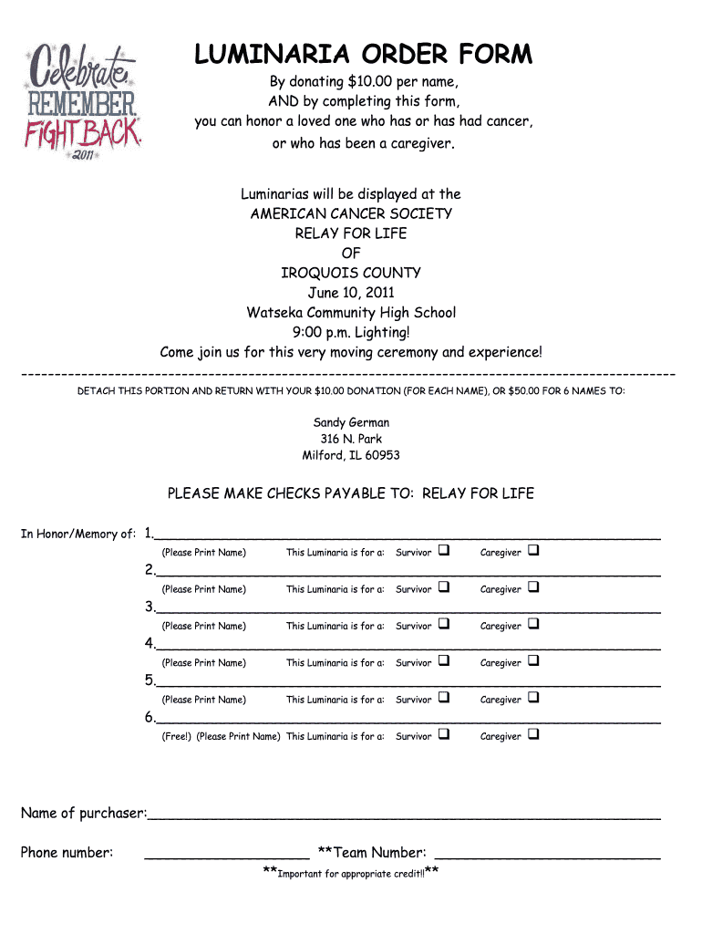 LUMINARIA ORDER FORM By donating $10.00 per name, AND by completing this form, you can honor a loved one who has or has had cancer, or who has been a caregiver. Luminaries will be displayed at the
